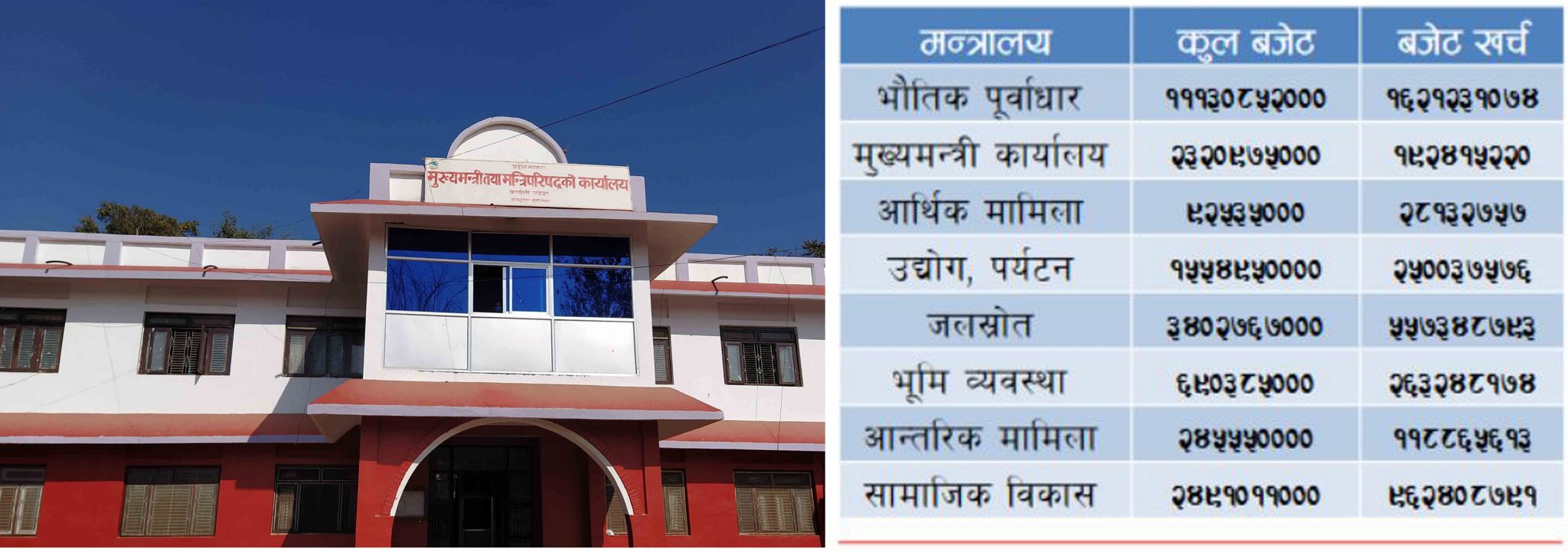 त्यस्तै मुख्य मन्त्री तथा मन्त्रीपरिषद्को कार्यालयको विकास बजेट खर्च निकै निराशाजनक छ । दुई अर्ब ३२ करोड ९७ लाख पाँच हजार विकास बजेट भएको मुख्यमन्त्री कार्यालयले हालसम्म साढे आठ प्रतिशत अर्थात १९ करोड २४ लाख १५ हजार दुइसय २० रुपैयाँ खर्च गरेको छ ।