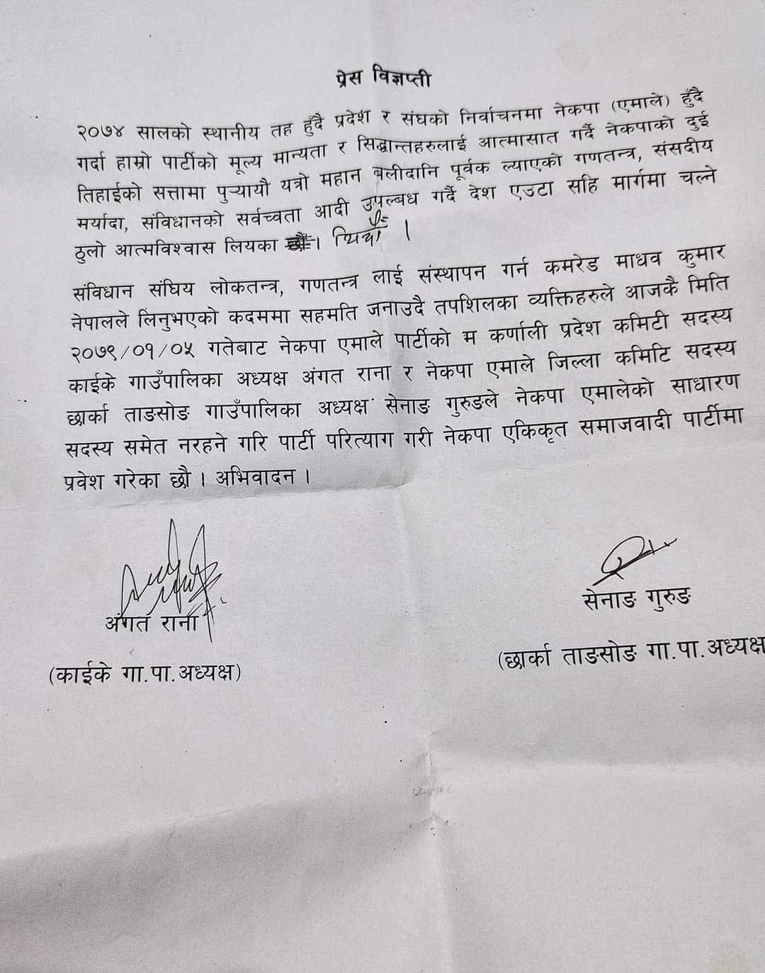 अध्यक्ष गुरुङ अघिल्लो चुनावमा स्वतन्त्रबाट चुनाव जितेपनि पछि एमालेमा समाहित भएका थिए । संविधान,लोकतन्त्र ,गणतन्त्र संस्थागत गर्न माधव नेपालले सहि कदम चालेको विज्ञप्तिमा उल्लेख गरिएको छ ।
