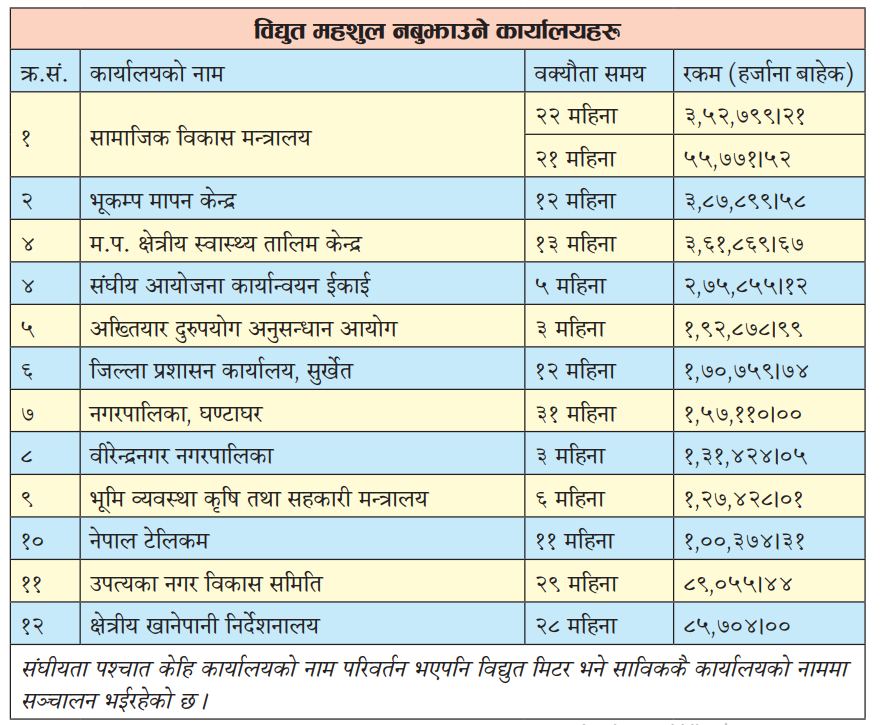 त्यसैगरी सात महिनादेखि सुर्खेत जिल्ला अदालतले, पाँच महिनादेखि क्षेत्रीय संग्राहलयले ४६ महिनादेखि नेपाल रेडक्रस सोसाइटी, कटकुवा स्वास्थ्य चौकीले नौं महिनादेखि विद्युत महशुल बुझाएका छैनन् ।
