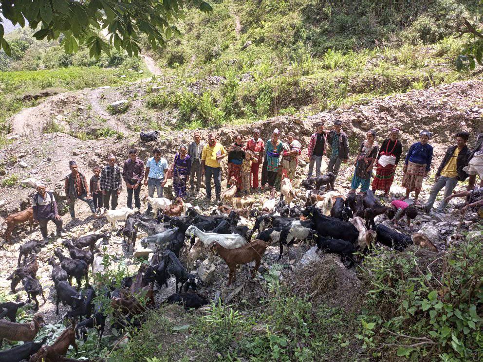 जाजरकोट , ४ असार ः नलगाड नगरपालिकाको आर्थिकमा (मासु मिसन कार्यक्रम) अन्तर्गत नलगाड नगरपालिका – ५ पोखरामा संचालित गोगनेरी,पोखरा बाख्रापालन कृषक समुहका २५ जना स्थानीयलाइ बाख्रा वितरण हुँदै ।