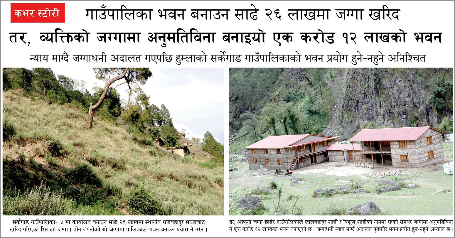 हुम्ला ः हुम्लाको सर्केगाड गाउँपालिकाले कार्यालय निर्माण गर्न भन्दै भिरालो जमिन साढे २६ लाखमा खरिद गर्यो । तर, एक करोड १२ लाखको प्रशासनिक भवन भने व्यक्तिको जग्गामा बनायो । थाहै नदिई जग्गा हडपेको भन्दै जग्गाधनीहरूले पालिकाविरुद्ध अदालतमा मुद्दा दायर गरेपछि लगभग तयार भइसकेको भवन प्रयोग हुने कि नहुने भन्ने अन्योल छ ।