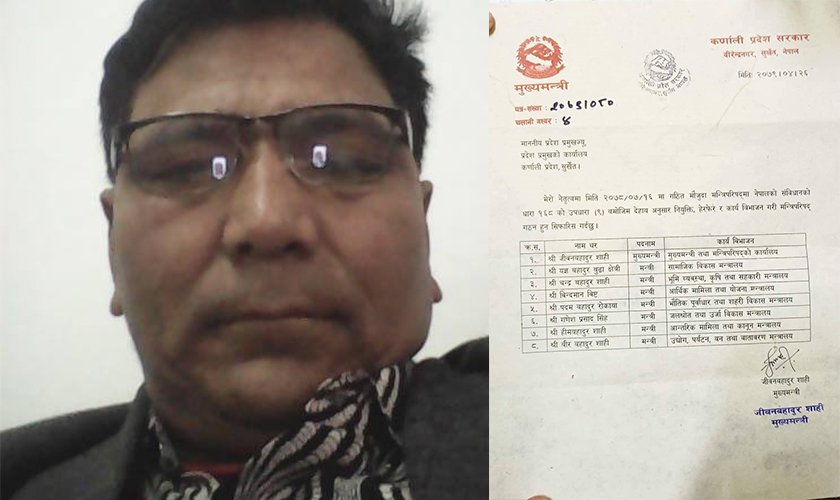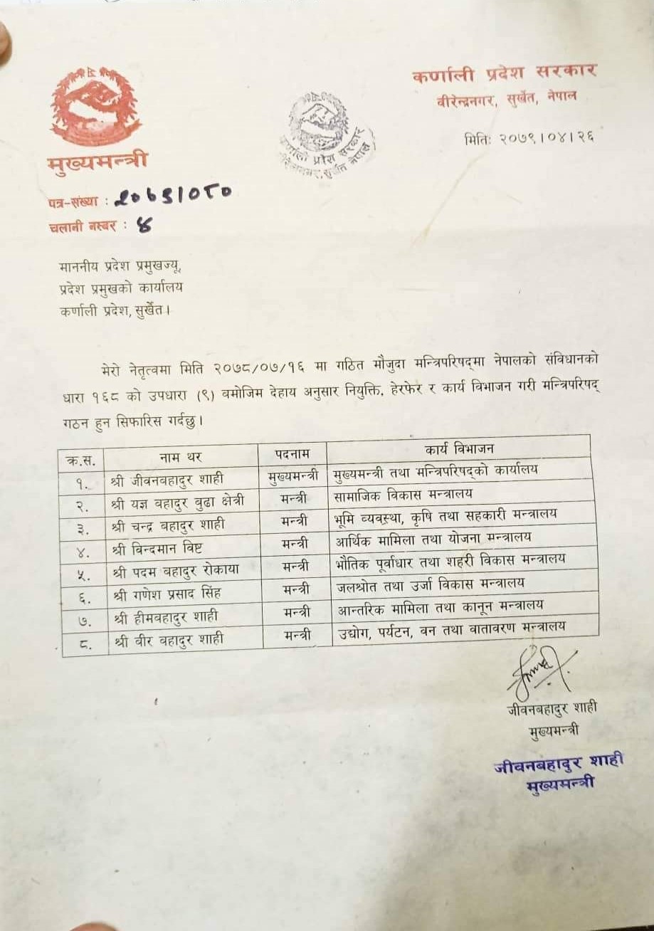 मुख्यमन्त्री जीवनबहादुर शाहीले संविधानको धारा १५८ को उपधारा (९) बमोजिम नियुक्ती, हेरफेर र कार्यविभाजन गरी मन्त्रिपरिषद् गठन गरेको भन्दै शाहीको शपथका लागि प्रदेश प्रमुखको कार्यालयलाई सिफारिस गरेका थिए । उक्त सिफारिस सँगै शाहीको आज सपथ हुने भएको हो । उनले डोल्पाबाट प्रतिनिधित्व गर्छन । शाही विवाद रहित नेता मध्यमा पर्दछन् ।