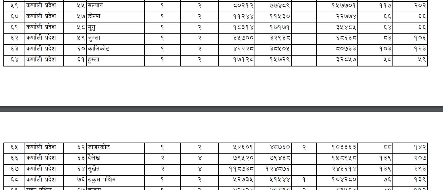 त्यस्तै सुर्खेतमा २९३ केन्द्र रहेका छन् भने स्थलको संख्या १३९ रहेको छ । रुकुम पश्चिमा १३९ केन्द्रमा ७६ स्थल रहेका छन् । कर्णाली भरीमा मतदान स्थलको संख्या ९३३ र स्थलको संख्या १ हजार ४०३ रहेको छ । २४ वटा प्रदेशसभा निर्वाचिन क्षेत्र संख्य रहेको छ । प्रतिनिधिसभा क्षेत्र संख्या १२ रहेको छ । महिला र पुरुष गरेर १० लाख ८ हजार ३०४ यहाँको कुल मतदाता संख्या रहेको छ ।