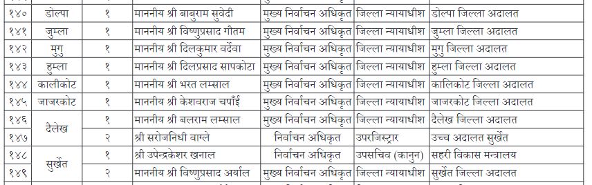 सुर्खेत ः आगामी मंसिर ४ गते हुने प्रतिनिधि सभा र प्रदेश सभा सदस्य निर्वाचनको प्रक्रिया सुरु भएसँगै निर्वाचन आयोग जनशक्ति व्यवस्थापनमा जुटेको छ । आयोगले निर्वाचन क्षेत्रमा खटिने प्रमुख निर्वाचन अधिकृत र निर्वाचन अधिकृतहरू नियुक्त गरेको छ । यही असोज ११ गतेदेखि लागू हुने गरी मुख्य निर्वाचन अधिकृत र निर्वाचन अधिकृतहरू तोकिएका हुन् । आयोगले देशभरका प्रतिनिधि सभातर्फ एक सय ६५ र प्रदेश सभातर्फ तीन सय ३० क्षेत्रका लागि निर्वाचन अधिकृत तोकेको हो । जिल्ला न्यायाधीशहरूलाई मुख्य निर्वाचन अधिकृतको जिम्मेवारी दिएको छ ।
