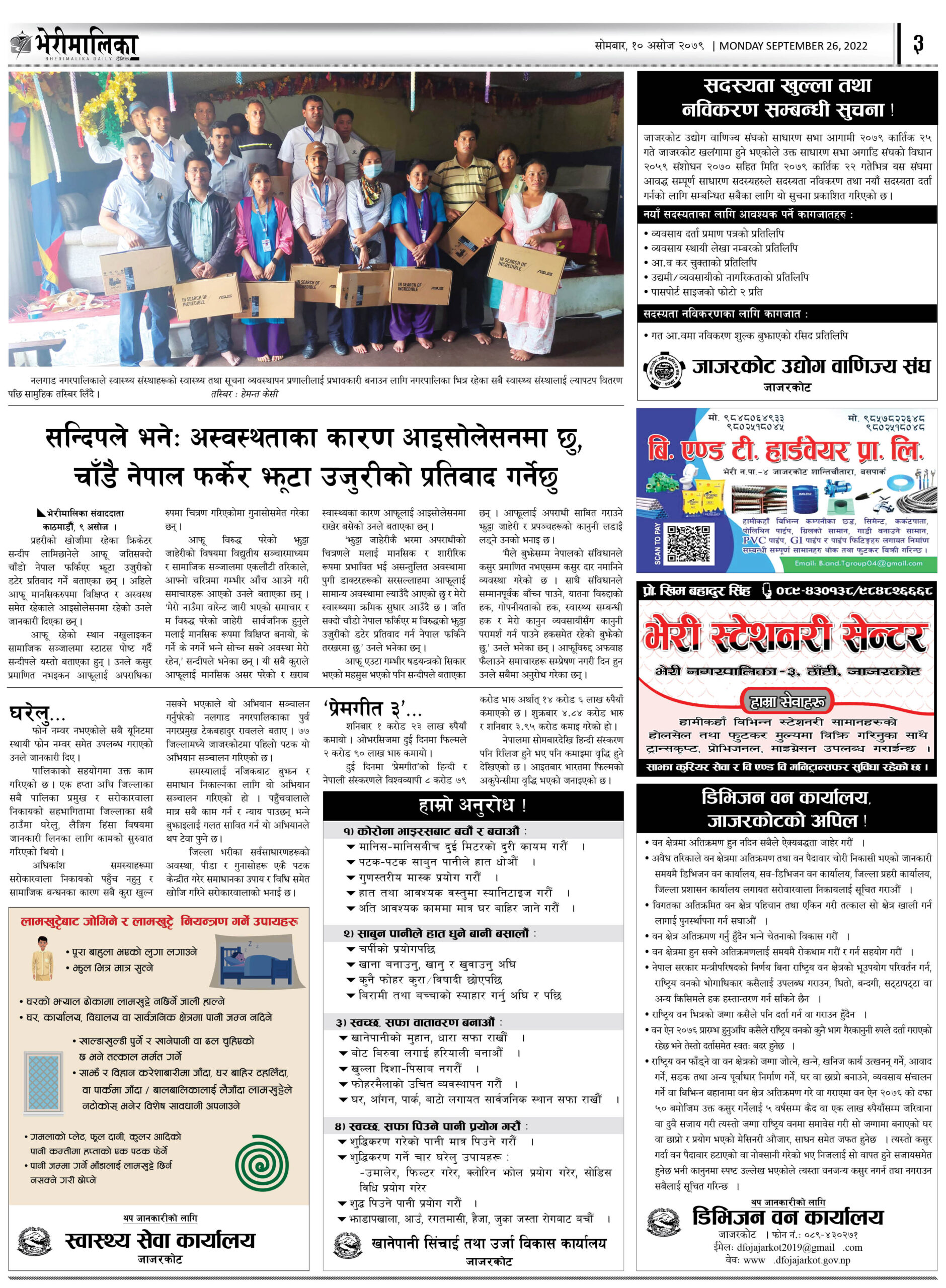 जाजरकोट ः प्रहरीको सचेतना अभियान देखि नलगाड नगरपालिकाले स्वास्थ्य संस्थामा विद्युतीय सामग्री वितरण सम्माको समाचारलाई मुख्य प्राथमिकता बनाएर छापिएको छ ।