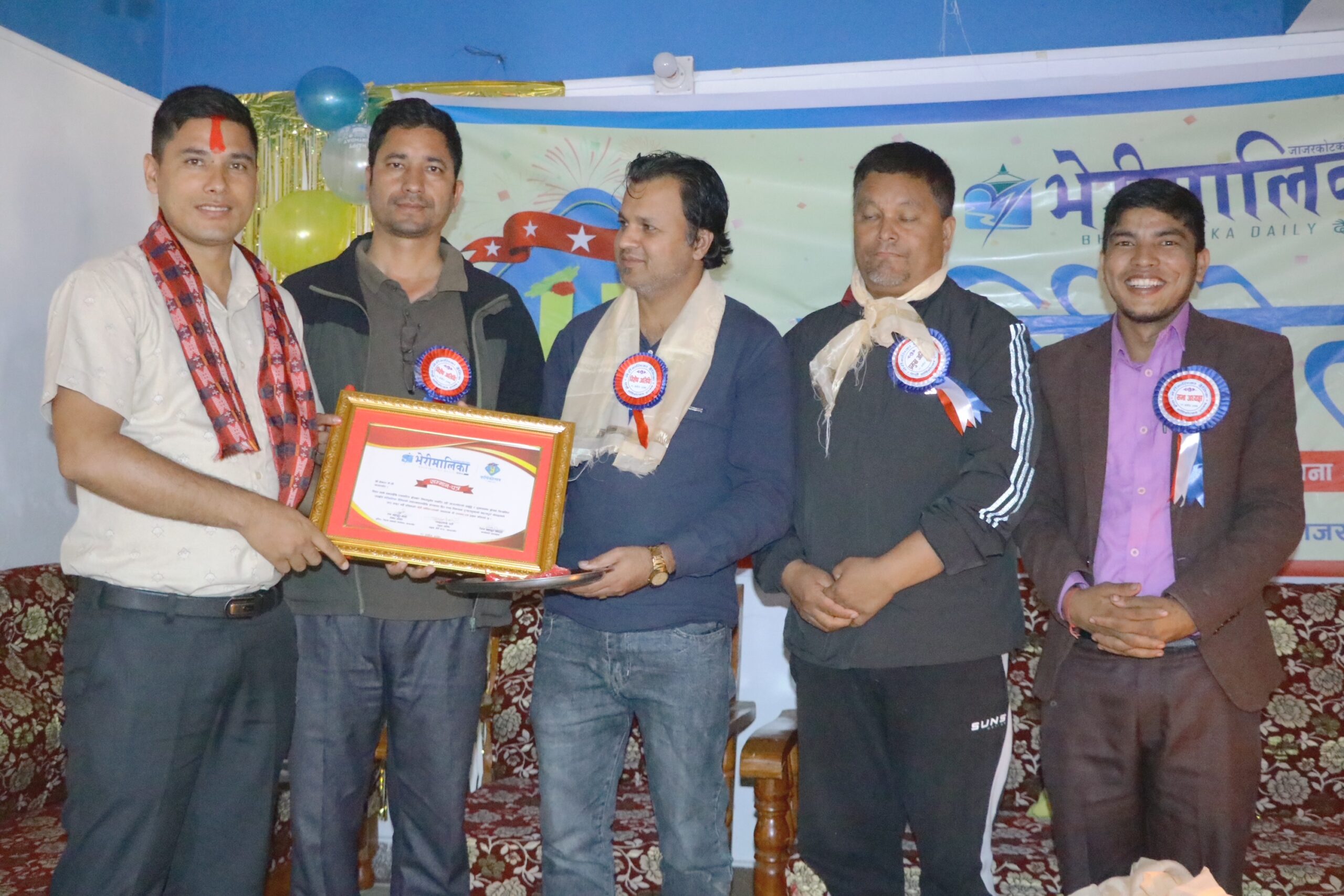 पत्रकार केसीलाई भेरीमालिका दैनिकले पाँचौँ बार्षिकोत्सवको अवसरमा सम्मान गर्दै