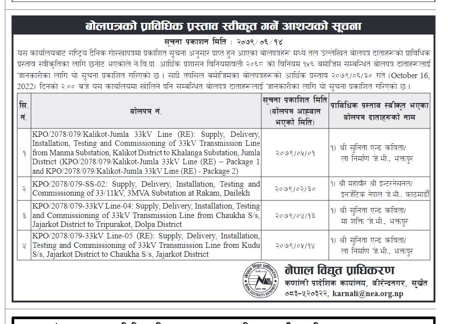 ’ श्री सुनिता एण्ड कविता मा शक्ति जेभी भक्तपुर र श्री सुनिता एण्ड कविता ला निर्माण जेभी भक्तपुरले ठेक्का पारेका छन् । यो ठेक्काको काम अघेल्लो ठेकेदारले काम नगर्दा जाजरकोटको नलगाड, बारेकोट विद्युत बाल्न समस्या हुँदै आएको छ । त्यस्तै छिमेकी जिल्ला डोल्पामा विद्युतीकरणमा विलम्व हुँदै आएको थियो । यहाँ रहेका जगदुल्ला जलविद्युत आयोजना , नलगाड जलविद्युत आयोजना र ताँक्सुगाड जलविद्युत आयोजनामा काम गर्न समस्या हुँदै आएको थियो ।