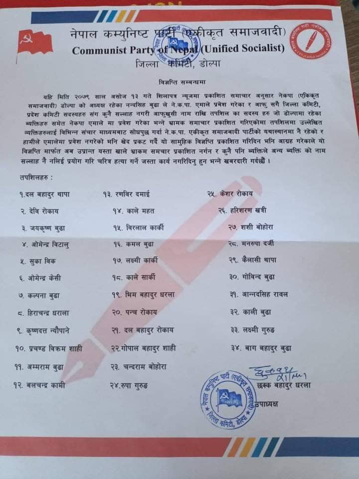 डोल्पा ः पुर्वमन्त्री नन्दसिंह बुढासँगै नेकपा ( एमाले) मा प्रवेश गरिएको भनि प्रचार गरिएका नेता तथा कार्यक्रताहरु नेकपा ( एकीकृत समाजवादी केन्द्र) मै रहेको भन्दै बिज्ञप्ति प्रकाशित गरेका छन् ।