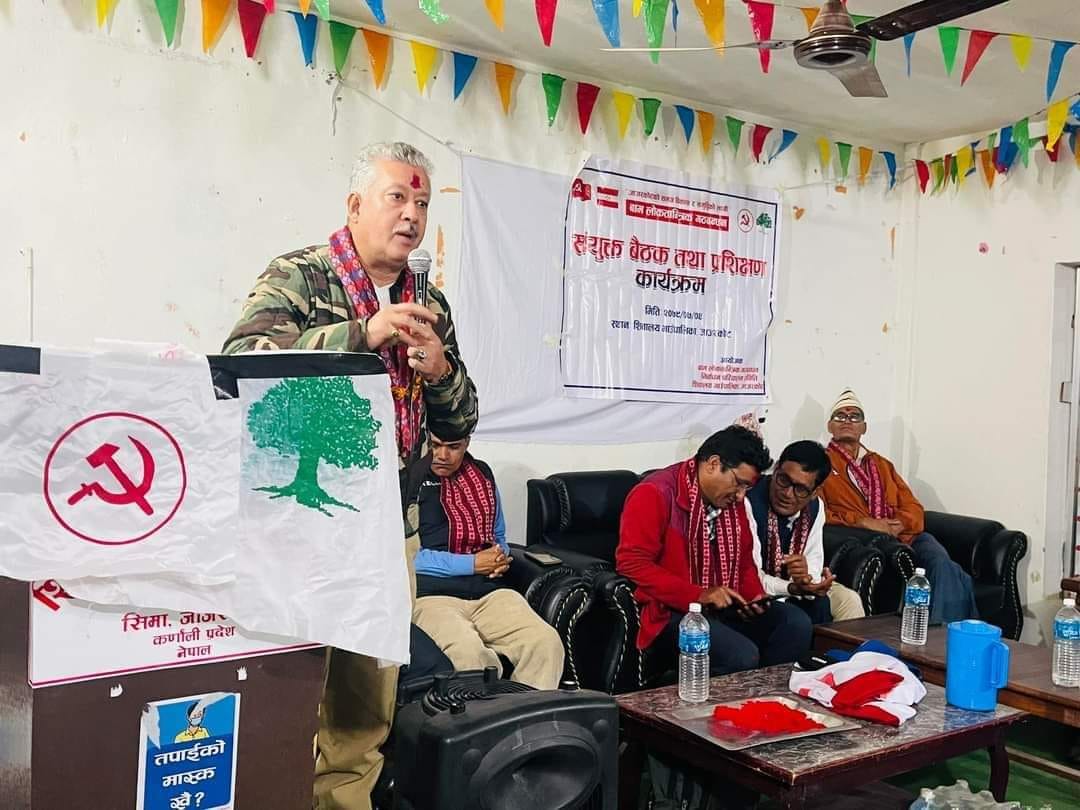 जाजरकोट , ४ कात्तिक ः शिवालय गाउँपालिका–३ स्थित प्रशासकीय केन्द्रमा आयोजना गरिएको कार्यक्रममा बाम लोकतान्त्रिक गठबन्धनको तर्फबाट प्रदेशसभा सदस्य (ख) का उम्मेदवार तथा नेपाली कांग्रेसका केन्द्रीय सदस्य राजिवविक्रम शाहद्घारा कार्यक्रताहरुलाई प्रशिक्षण दिर्नुहुँदै ।