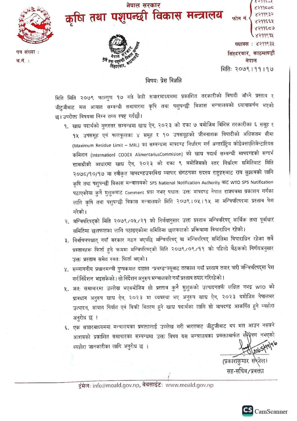 नेपाल सरकार कृषि तथा पशुपन्छी विकास मन्त्रालयले तरकारीको विषादी जाँच्ने प्रस्ताव र जिटुजीमार्फत मल आयात गर्ने प्रस्तावबारे भ्रामक समाचार प्रकाशन भएको भन्दै खण्डन गरेको छ।