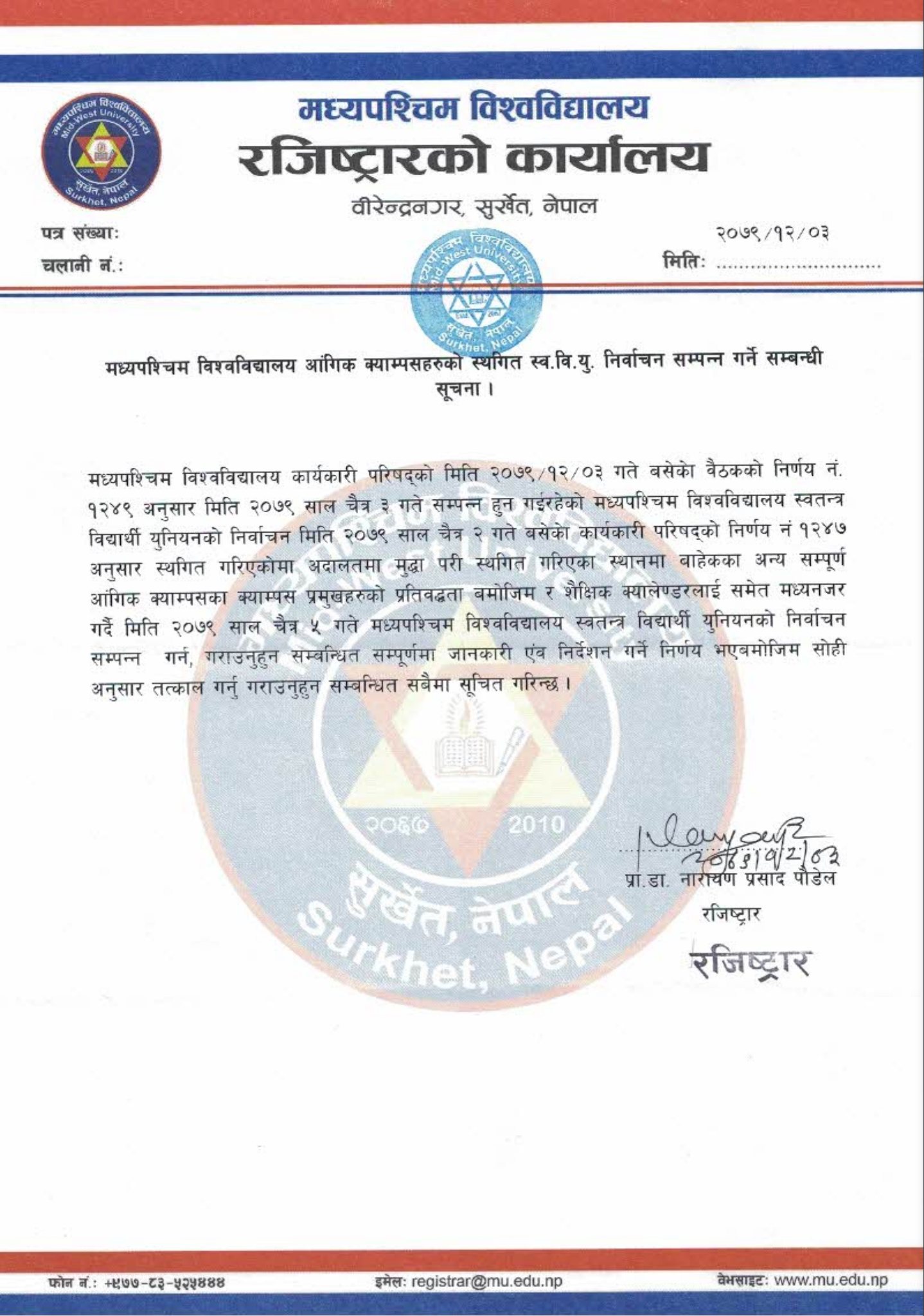चैत ५ गते स्ववियु निर्वाचन गराउन मध्यपश्चिम विश्वविद्यालयको निर्देशन