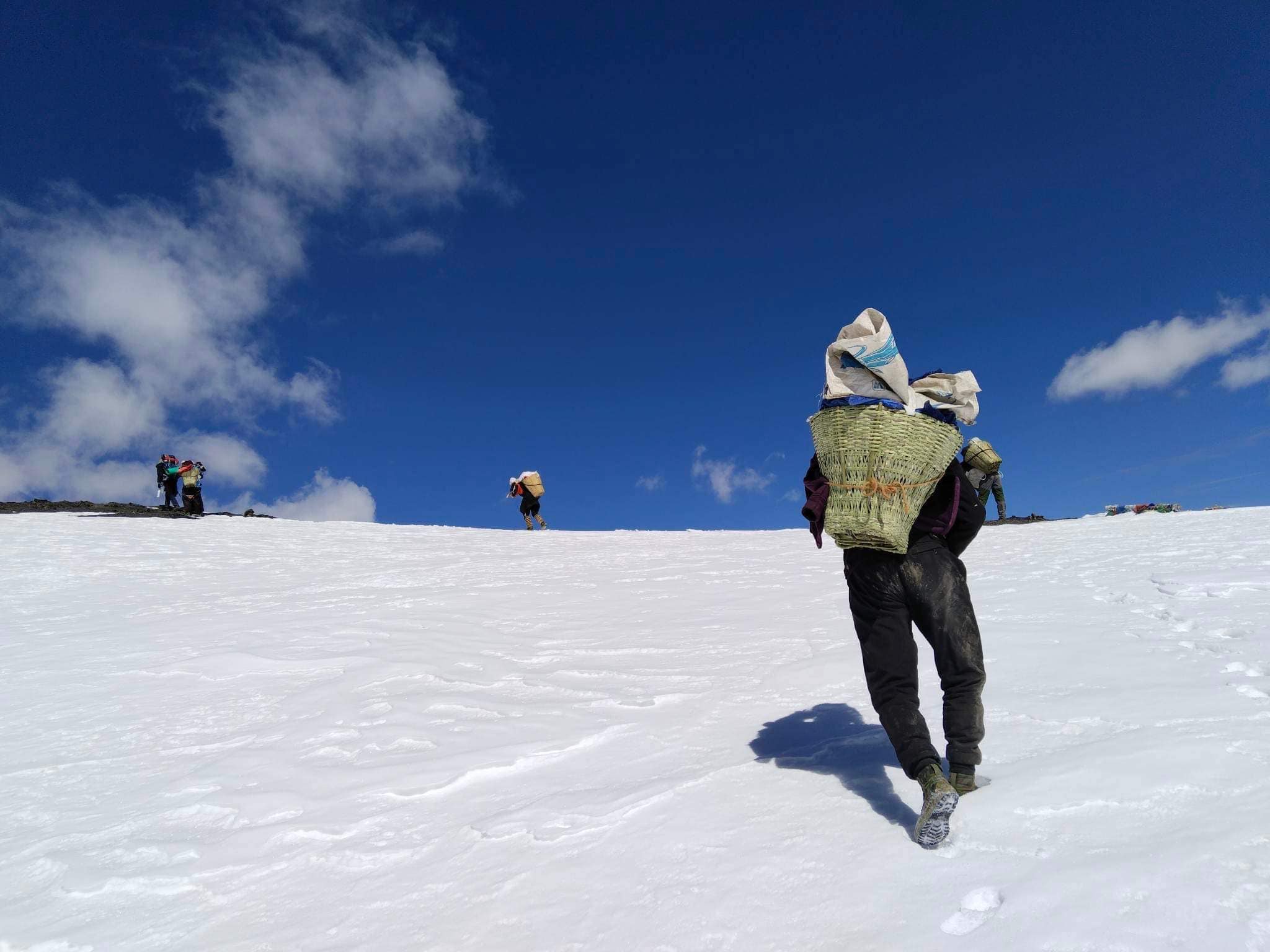 डोल्पा , ३ वैशाख ः शे फोक्सुण्डो गाउँपालिकाको वडा नम्वर ८ र ३ को बीचमा पर्ने ५हजार २५० मिटर काङला पास हिमाल पार गर्दै वडा नम्वर ५ का वडाध्यक्ष कार्मा तार्के गुरुङ सहितका सर्बसाधारणहरु । सडक सञ्जालसँग नजोडिएको उपल्लो डोल्पामा सदरमुकाम दुनैबाट आवश्यक सामग्री लिएर यो हिमाल पार गरेर जानुपर्ने , आउनुपर्ने बाध्यता रहेको छ ।