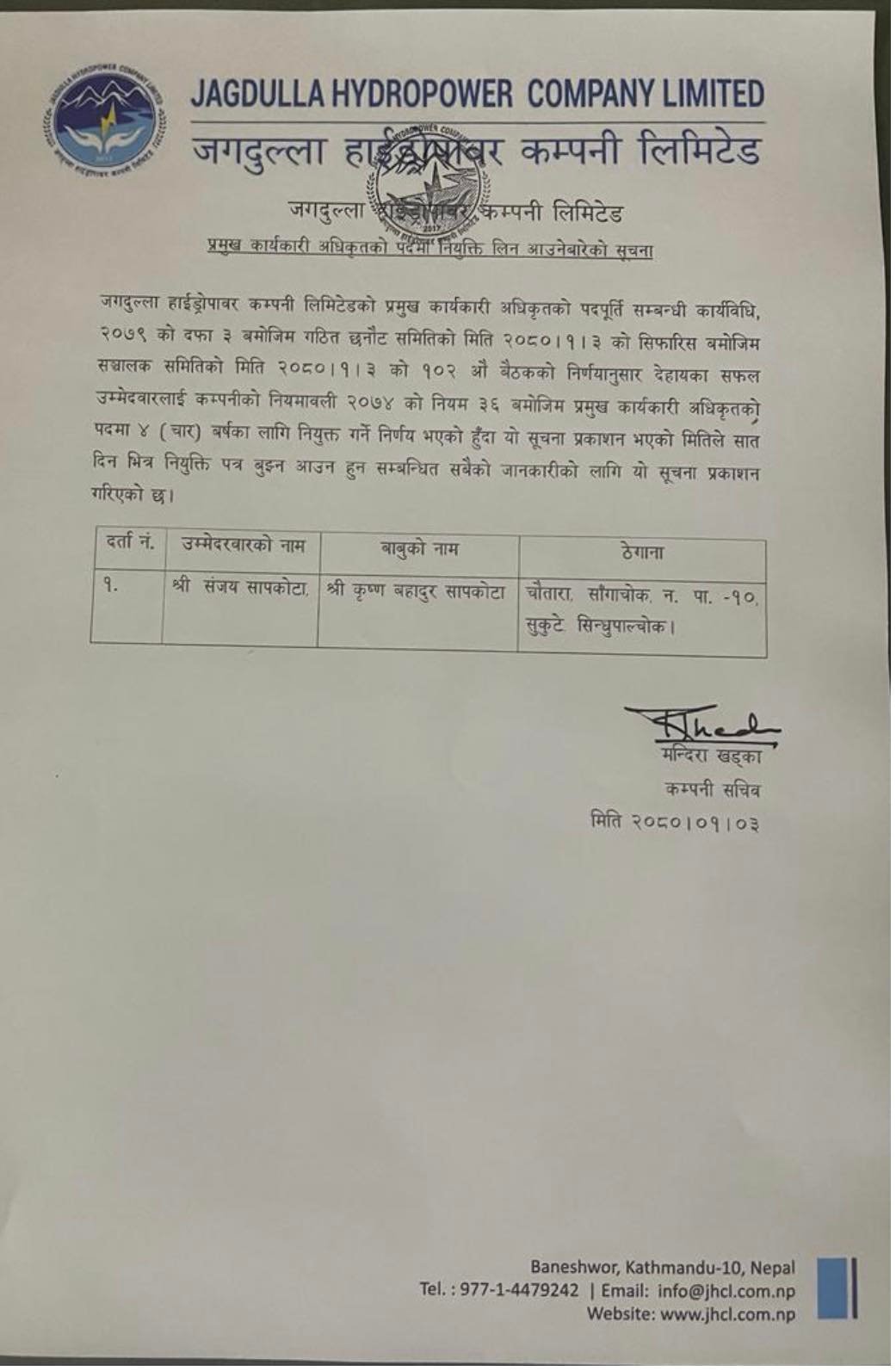 जगदुल्ला जलविद्युत आयोजनाको सिइओमा सापकोटा