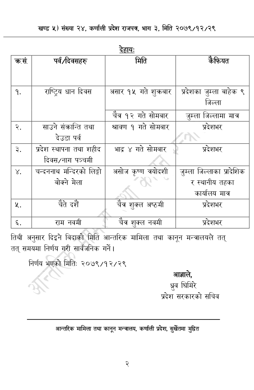 सुर्खेत ः कर्णाली प्रदेश सरकारले कर्णालीका १० वटै जिल्लामा लागू हुने गरि ६ दिन सार्वजनिक विदा दिने निर्णय गरेको छ। आन्तरिक मामिला तथा कानून मन्त्रालयले आज ९सोमबार० प्रदेश राजपत्रमा एक सूचना जारी गर्दै सो जानकारी दिएको हो।