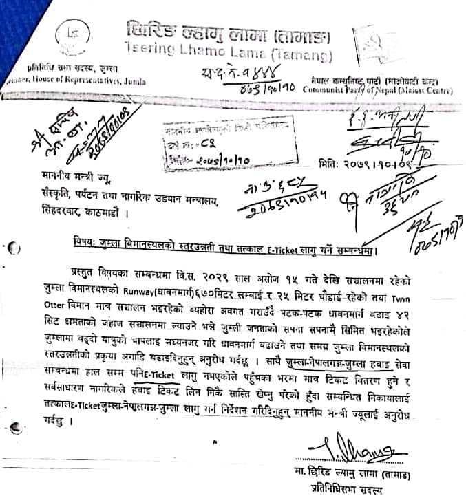 त्यस्तै कर्णालीमा अनलाइनबाट पनि टिकट लिन मिल्ने भएपछि यहाँका सर्वसाधारणहरु खुसी भएका छन् । पहुँचको भरमा टिकट पाइने कर्णालीमा प्रतिनिधिसभा सदस्य छिरिङ ल्यापुकै पहलमा पर्यटनमन्त्रीलाई ज्ञापनपत्र बुझाएपछि अनलाइन टिकटको सुरुवात गरिएको थियो । नेपाली भाषाको उद्गम क्षेत्र जुम्लाको सिँजालाई विकास गर्नका लागि सिँजा सभ्यता र विकासका लागि सम्वन्धी पहिलो चरणमा संग्रालय लगाएतका कामहरु हुन लागेका प्रतिनिधिसभा सदस्य छिरिङ ल्हामुुले बताइन् । कर्णाली प्रदेशमा पेश भएको उक्त विद्येयक तत्कालिन मुख्यमन्त्री जीवनबहादुर शाहीको असहयोगका कारण असफल भएको थियो । सिँजा सभ्यता र विकासका लागि संघीय सरकारको मन्त्रीपरिषदबाट समेत सम्वोधन भएको प्रतिनिधिसभा सदस्य छिरिङ ल्हामुुले बताइन् । अहिले सिँजामा संग्रालय लगाएतका कामहरु हुने छन् ।