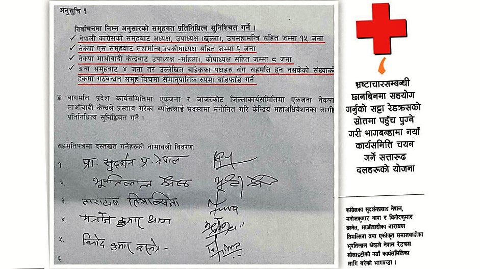 भ्रष्टाचारसम्बन्धी छानबिनमा सहयोग गर्नुको सट्टा सत्तारूढ दलहरूले रेडक्रसको स्रोतमा पहुँच पुग्ने गरी भागबन्डामा नयाँ कार्यसमिति चयन गर्ने योजना बनाएका हुन् । दलीय सहमतिबाट नेतृत्व चयन गर्ने प्रपञ्चमा सहयोग पुग्ने गरी जिल्ला प्रशासन कार्यालयले असार १० मा रेडक्रस केन्द्रीय कार्यालयलाई पत्र पठाएको छ । जबकि रेडक्रसको विधान २०२० (सत्रौं संशोधन, २०७५ सहित) र रेडक्रसको निर्वाचन नियमावली २०४९ मा व्यवस्था गरिएबमोजिम केन्द्रीय, प्रदेश र जिल्ला कार्यसमितिको निर्वाचनमा ‘निर्वाचन अधिकारी’ तोक्ने अधिकार केन्द्रीय कार्यसमितिलाई मात्र छ ।
