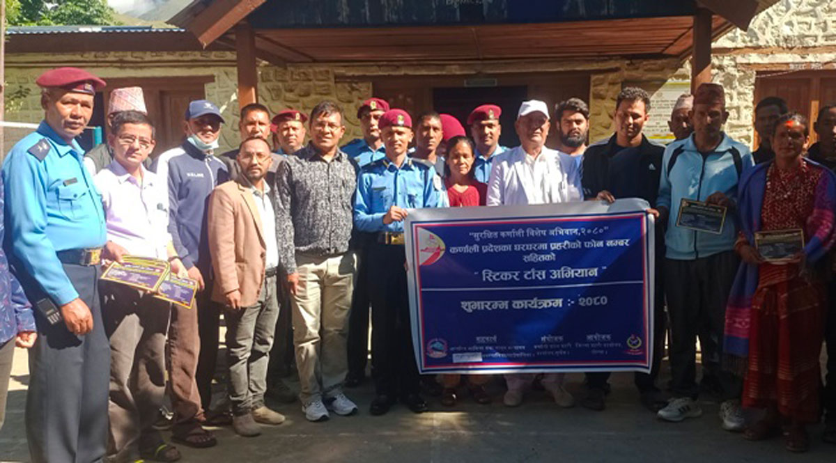 डोल्पा ः त्रिपुरासुन्दरी र ठुलिभेरी नगरपालिकाका चार हजार ८ सय घरधुरीमा प्रहरीले सुरक्षित कर्णाली विशेष अभियान २०८० अन्तर्गत फोन नम्बरसहितको स्टिकर टाँस गर्न सुरु गरेको छ । पहिलो चरणमा ठुलिभेरी नगरपालिका र त्रिपुरासुन्दरी नगरपालिकाबाट छुट्टाछुट्टै कार्यक्रम गरेर प्रहरीको फोन नम्बरसहितको स्टिकर घरघरमा टाँस सुरु गरिएको हो ।