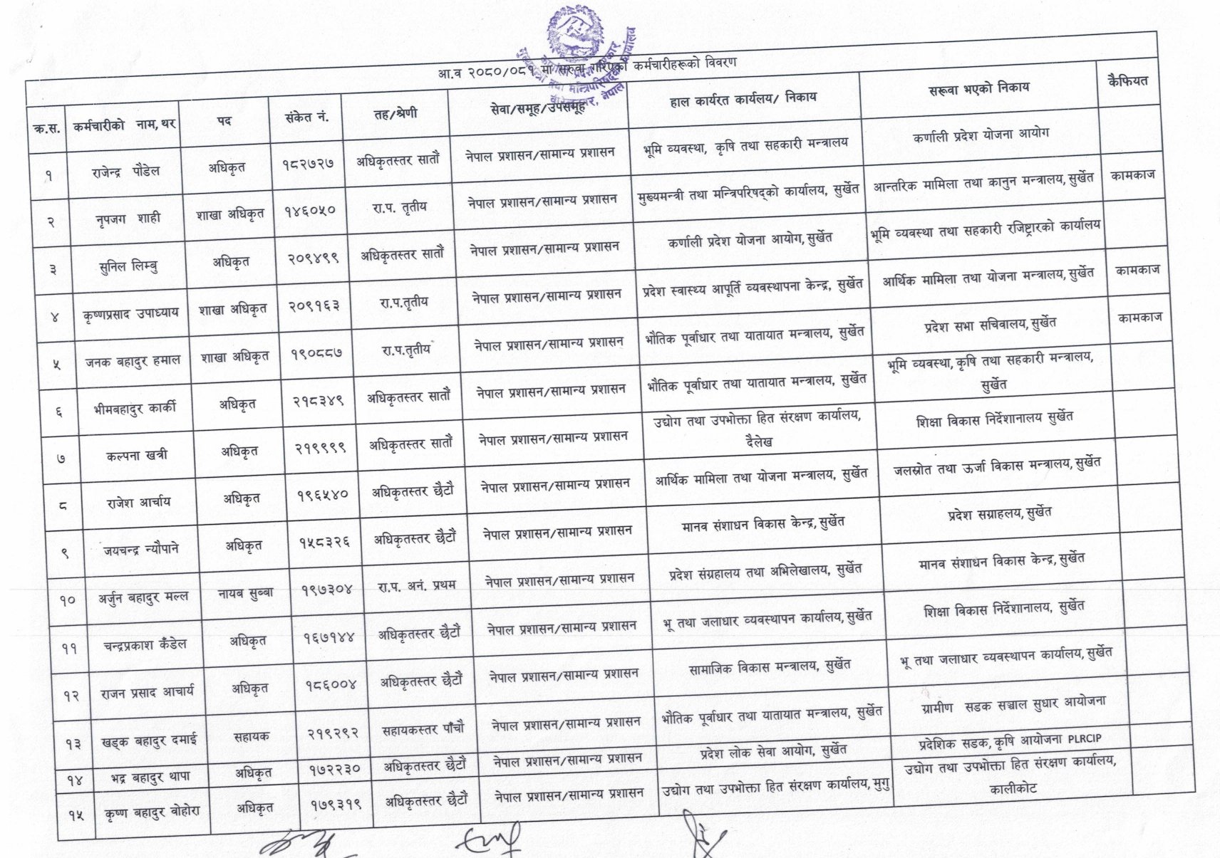 मुख्यमन्त्री तथा मन्त्रिपरिषद्को कार्यालयमा कार्यरत शाखा अधिकृत नृपजङ्ग शाहीलाई कानुन मन्त्रालयमा कामकाजका रूपमा पठाइएको छ । भौतिक पूर्वाधार तथा सहरी विकास मन्त्रालयका पनि तीन जना कर्मचारीलाई सरुवा गरिएको छ । सरुवा हुनेमा एक जना शाखा अधिकृत, एक जना अधिकृत र एक जना सहायक रहेका छन् । शाखा अधिकृत जनकबहादुर हमाललाई प्रदेश सभा सचिवालयमा कामकाजका लागि खटाइएको छ भने भीमबहादुर कार्कीलाई भूमि, व्यवस्था, कृषि तथा सहकारी मन्त्रालयमा पठाइएको छ ।