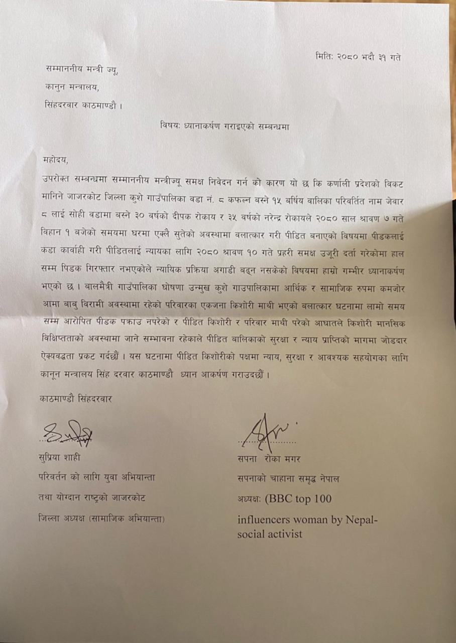 जाजरकोट, असोज ३१ ः कुशे गाउँपालिका ८ की नाबालिकालाई बलात्कार गर्ने आरोपित अझैँ पक्राउ पर्न नसकेको भन्दै अधिकारकर्मीले कानुन , न्याय तथा संसदीय मामिला मन्त्री धनराज गुरुङको ध्यानाक्रर्षण गराएका छन् । गाउँपालिकाको वडा ८ कै ३० बर्षीय दीपक रोकायले नाबालिकालाई जवरजस्ती बलात्कार गरेको उजुरी जिल्ला प्रहरी कार्यालयमा परेको ५० दिन बितिसक्दा पनि आरोपित रोकाय पक्राउ पर्न सकेका छैनन् । शक्ति केन्द्रको आडमा उनलाई पक्राउ नगरिएको अधिकारकर्मीको आरोप छ । महिना दिन बित्दा पनि एक व्यक्तिलाई पक्राउ गर्न नसक्नुले सुरक्षा व्यवस्था माथी प्रश्न चिन्ह् खडा भएको अधिकारकर्मीको भनाई छ । परिवर्तनका लागि यूवा अभियानकी सुप्रिया शाही ,सपनाको चाहाना समृद्ध नेपालकी अध्यक्ष्य सपना रोका मगरल संयूक्त रुपमा उक्त ध्यानाक्रर्षण पत्र आज बुझाएका हुन् ।
