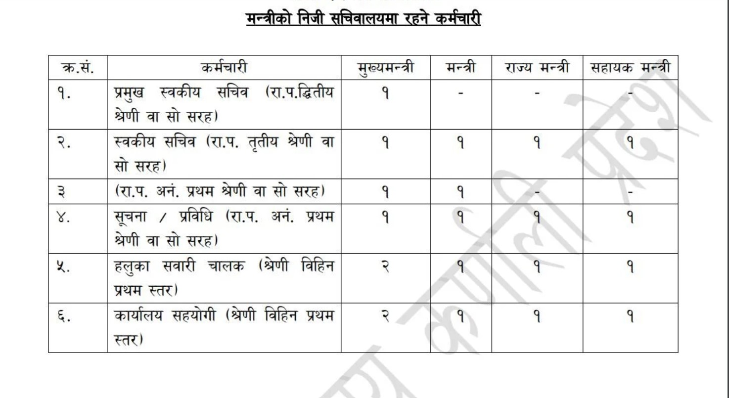 यस्तै मन्त्रीहरुको हकमा दुई जना स्वकीयसहित सूचना प्रविधि, हलुका सवारी चालक र कार्यालय सहयोगी राख्न पाउने व्यवस्था छ ।
