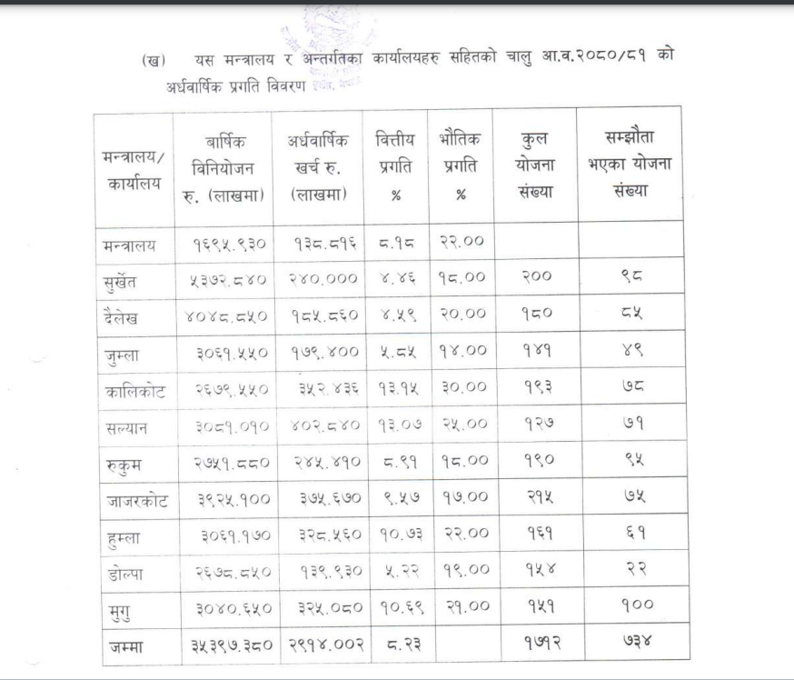 त्यसपछि दोस्रोमा जुम्ला रहेको छ । जुम्लामा मन्त्रालयले पठाएको १३९ योजनामा ४९ वटा योजनाको मात्र सम्झौता भएको पाइएको छ । मन्त्रीकै जिल्ला डोल्पामा विकासे योजनामा टेन्डर गर्न नदिने देखि राजनीतिक दबाबका कारण योजना सम्झौता कम भएको स्रोतले बताएको छ । अधिकांश योजनाहरु प्रदेशबाट किनेर ल्याइएको छ , बोलपत्र गर्न दिदैनन कसरी हुन्छ काम ? एक कर्मचारीले बताए । मन्त्रालयको वित्तिय प्रगती ८.१८ प्रतिशत रहेको छ भने भौतिक प्रगती २२ प्रतिशत रहेको पाइएको छ ।