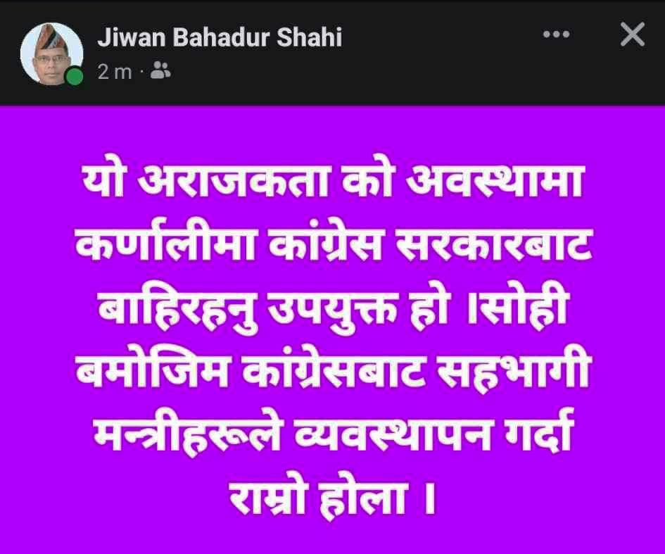 ‘यो अराजकता को अवस्थामा कर्णालीमा कांग्रेस सरकारबाट बाहिरहनु उपयुक्त हो ।सोही बमोजिम कांग्रेसबाट सहभागी मन्त्रीहरूले व्यवस्थापन गर्दा राम्रो होला ।’ नेता शाहीले लेखेका छन्।
