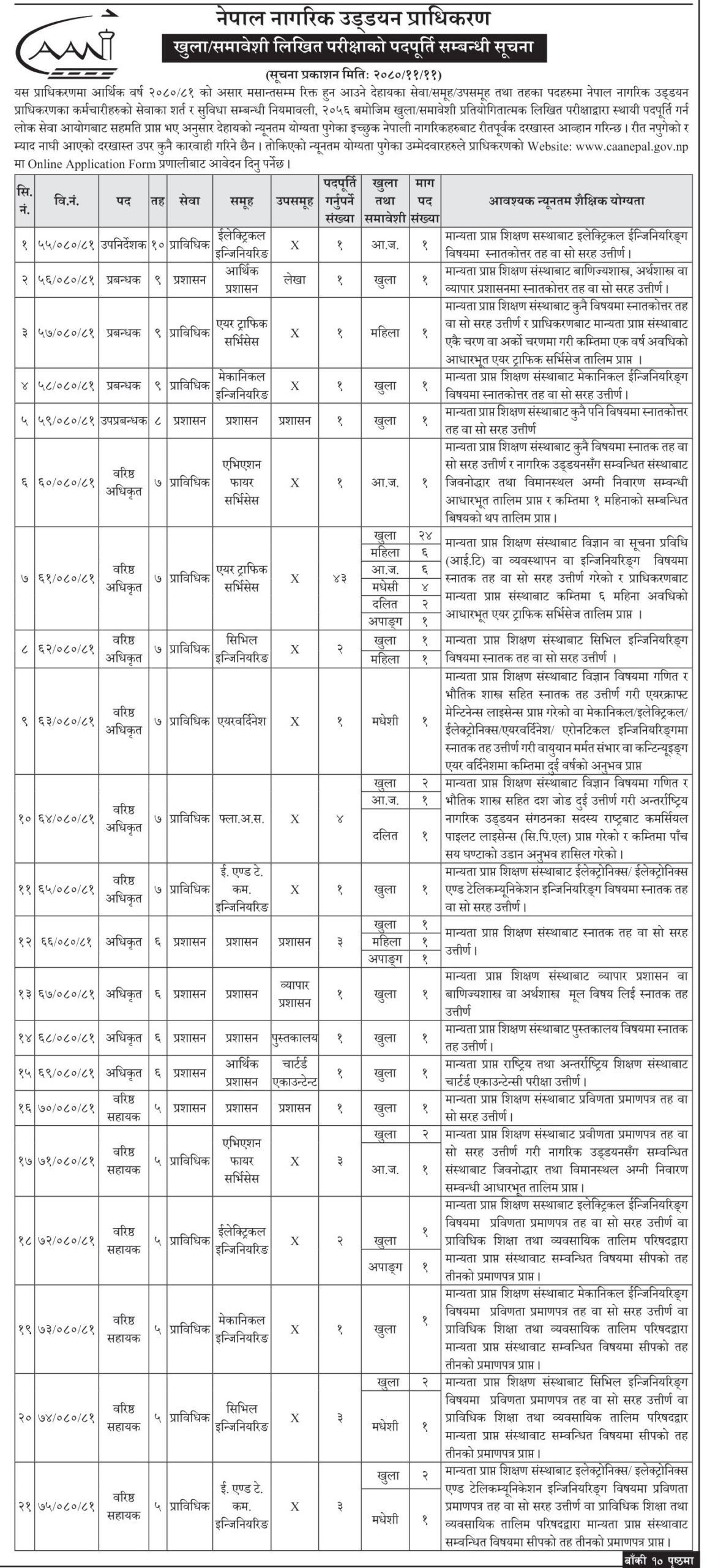 प्राधिकरणले प्राविधिकतर्फ दसौं तहको उपनिर्देशक, प्रबन्धक, उपप्रबन्धक, वरिष्ठ अधिकृतमा १÷१ जना, एयर ट्राफिकतर्फ वरिष्ठ अधिकृतमा ४३ जना दरखास्त मागेको हो। त्यस्तै विभिन्न उपसमूहतर्फ वरिष्ठ सहायक र सहायक पदमा पनि आवेदन खुला गरेको प्रधिकरणले जनाएको हो।