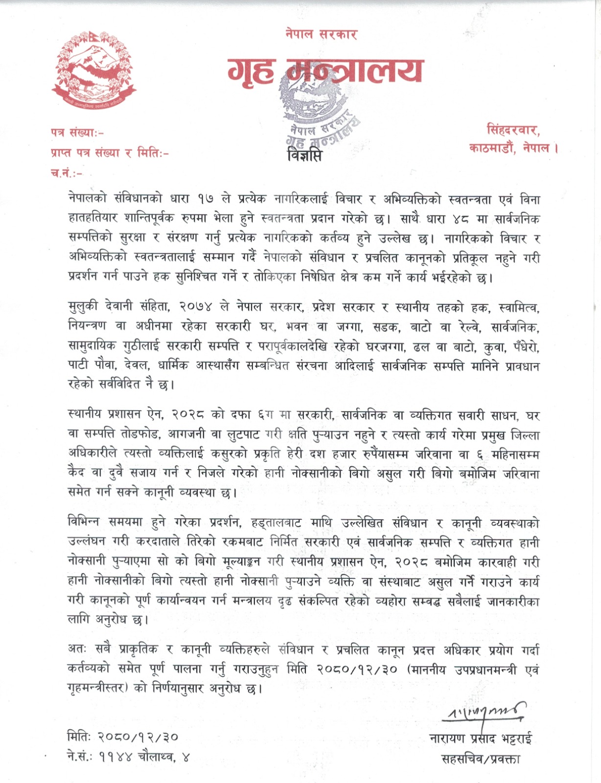 ‘शान्तिपूर्ण आन्दोलन गर्न पाउने अधिकारप्रति सम्मान छ। यो लोकतन्त्रको सौन्दर्य हो। तर, आन्दोलनको क्रममा सार्वजनिक सम्पत्ति तोडफोड गर्न पाइँदैन,’ गृह मन्त्री लामिछानेल भनेका छन, ‘त्यसैले आन्दोलनका क्रममा भएको वा हुने क्षतिको भर्पाईका लागि आयोजक (व्यक्ति, संस्था वा दल) लाई बिल पठाउने र सरकारी बाँकी सरह उठाउने निर्णय भएको छ।’