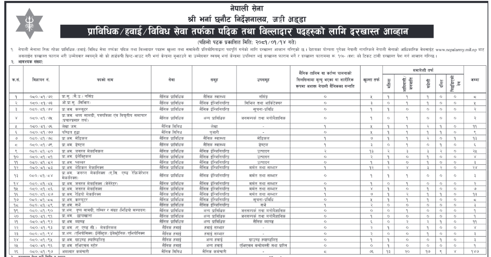 काठमाडौँ ः नेपाली सेनाको भर्ना छनोट निर्देशनालय, जङ्गी अड्डाले १४७ जना प्राविधिक कर्मचारी माग गर्दै दरखास्त आह्वान गरेको छ ।