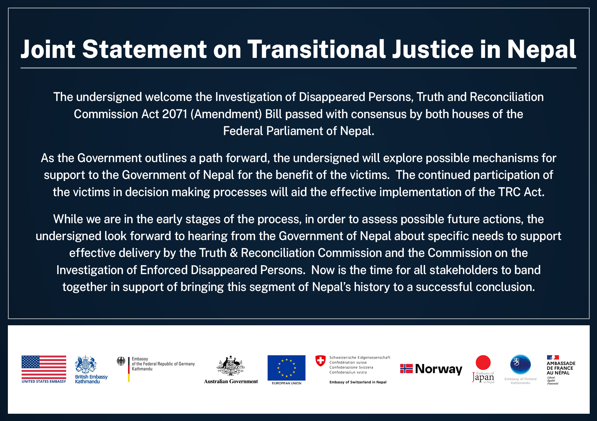 राष्ट्रपति रामचन्द्र पौडेलले विधेयक प्रमाणीकरण गरेसँगै संयुक्त विज्ञप्ति जारी गर्दै ती देशहरुले अन्तर्राष्ट्रिय समर्थन जनाएका हुन् ।