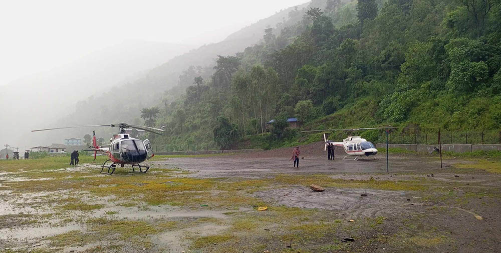 डोल्पाबाट सुर्खेततर्फ उडेका दुई हेलिकोप्टर आकस्मिक रुपमा आठबिसकोटमा अवतरण भएका थिए। लगातारको वर्षा नरोकिएको र रातिसमेत भइसकेकोले दुबै हेलिकोप्टर अवतरण भएकै स्थानमा रहने भएको आठबिसकोट नगरपालिका प्रमुख रबि केसीेले जानकारी दिनुभयो।