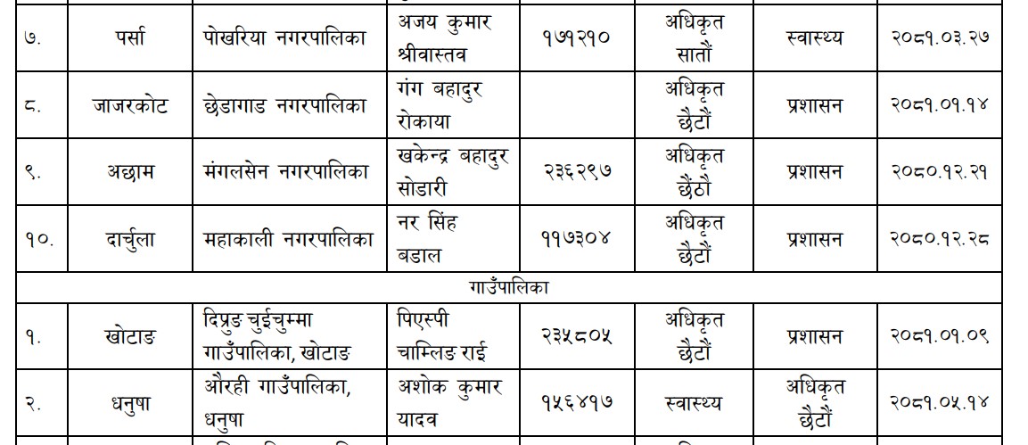 स्वास्थ्यकर्मी देखि प्राविद्यिक धारका कर्मचारीलाई निमित्त दिएर आर्थिक तथा प्रशासनिक कामहरु हुँदै आएकोमा अब सो ठाउँमा नयाँ जिम्मेवारीका साथ प्रमुख प्रशासकीय अधिकृत पठाइदिने मन्त्रालयले जनाएको छ । धनुसाको धनुसाधाम नगरपालिका , सप्तरीको कन्तरुप नगरपालिका , सिराहको सिराह नगरपालिका , महोतरीको लोहरपट्टी नगरपालिका , भाँगाह नगरपालिका , बाराको महागढीमाई , पर्साको पोखरिया , जाजरकोटको छेडागाड , अछामको मंगलसेन , दाचुलाको महाकाली नगरपालिकाका निमित्त प्रमुख प्रशासकीय अधिकृतलाई जिम्मेवारीबाट हटाएको छ ।