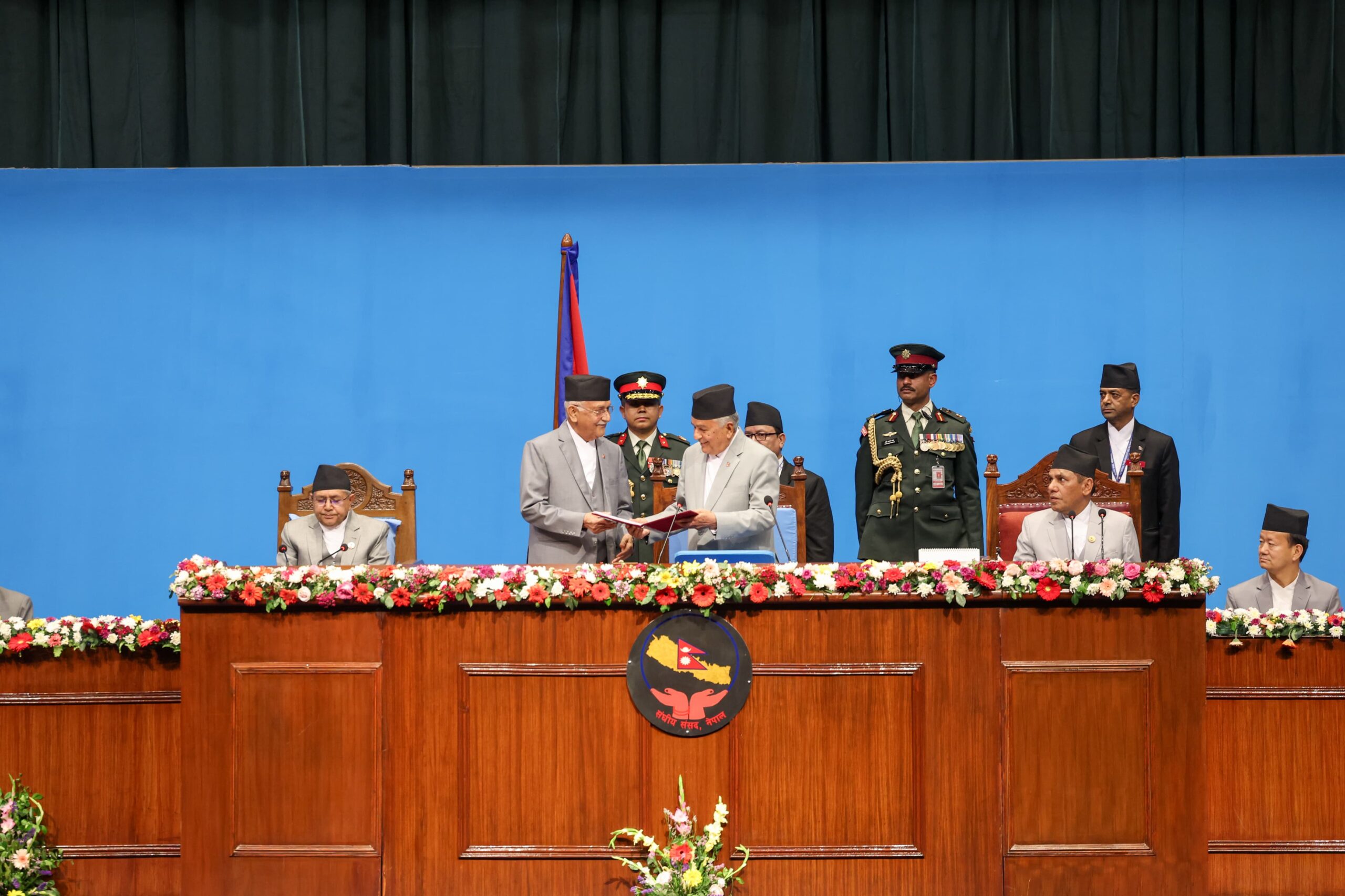 आगामी आर्थिक वर्षका लागि ठूला दलको सरकारले तयार पारेको नीति तथा कार्यक्रम शुक्रबार प्रधानमन्त्री ओलीले संसदमा आफ्नै हातले राष्ट्रपति रामचन्द्र पौडेललाई बुझाएका छन् । घोडसवार बग्गीसहित शीतनिवासबाट संसद भवन आएका राष्ट्रपति पौडेलले दुबै संसदको संयुक्त बैठकमा ६० पृष्ठ लामो पुस्तिका वाचन गरेर सरकारका नीति तथा कार्यक्रमहरु सार्वजनिक गरिसकेका छन् । अबको दिनदेखि प्रधानमन्त्री ओलीलाई प्रचण्ड र वर्षमानतिर फर्कने सुविधा छैन ।