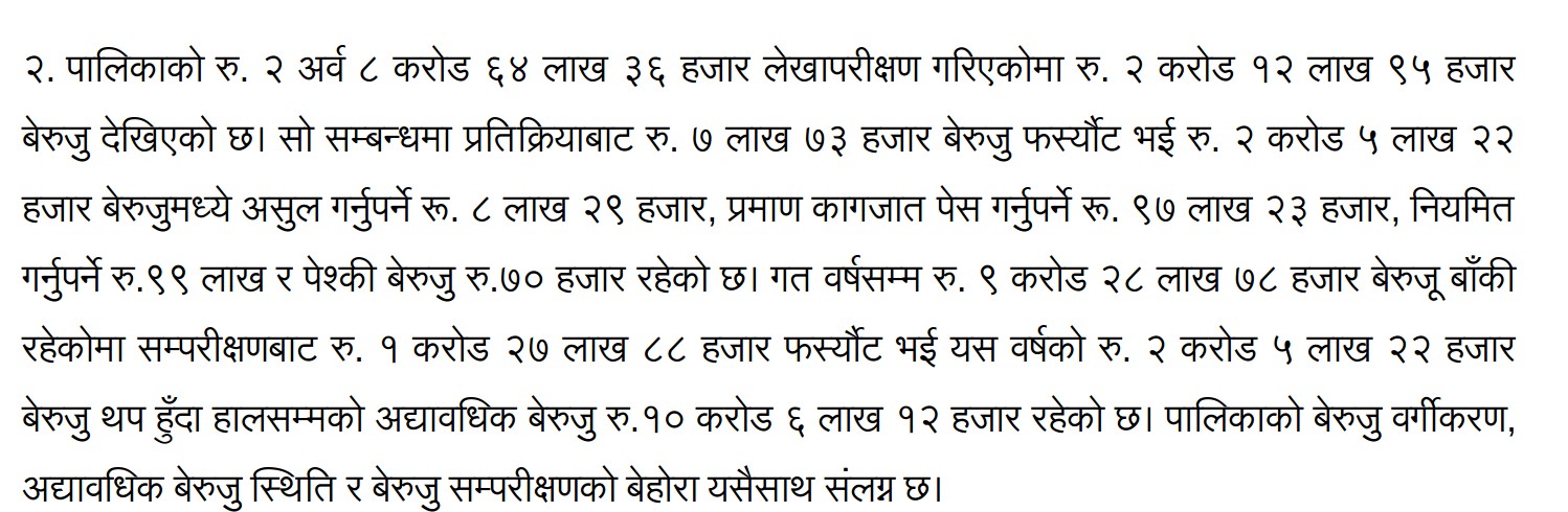 नगरपालिकाको आर्थिक अनुशासन कमजोर देखिएको छ । महालेखा परीक्षकको कार्यालयले सार्वजनिक गरेको प्रतिवेदन अनुसार आर्थिक वर्ष २०८०र०८१ मा नगरपालिकाको कुल २ अर्ब ८ करोड ६४ लाख ३६ हजार रुपैयाँ बराबरको लेखापरीक्षण गरिएकोमा त्यसमध्ये २ करोड १२ लाख ९५ हजार रुपैयाँ बेरुजु देखिएको छ । सो बेरुजुमध्ये ७ लाख ७३ हजार रुपैयाँको फस्र्योट भइसकेको छ भने बाँकी २ करोड ५ लाख २२ हजार रुपैयाँमध्ये ८ लाख २९ हजार असुल गर्नुपर्ने, ९७ लाख २३ हजार प्रमाण कागजात पेस गर्नुपर्ने, ९९ लाख नियमित गर्नुपर्ने र ७० हजार रुपैयाँ पेश्की बेरुजु रहेको देखिएको छ ।