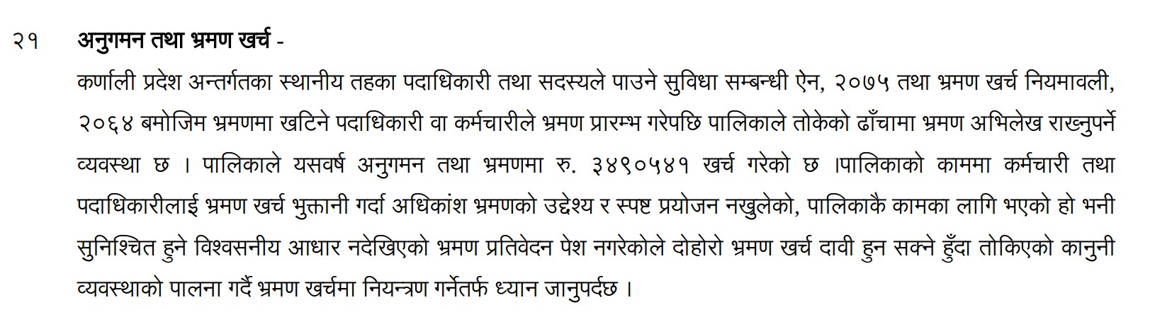यसले गर्दा एकै भ्रमणमा दोहोरो खर्च दाबी हुने सम्भावना देखिएको छ । साथै नगरपालिकाले खाना, विविध खर्च, बैठक भत्ता र आर्थिक सहयोगका नाममा समेत ४३ लाख ३४ हजार ९ सय ३२ रुपैयाँ खर्च गरेको छ । यसमध्ये २५ लाख ३२ हजार ३ सय रुपैयाँ विविध शीर्षकमा, ९ लाख २० हजार आर्थिक सहायता र ८ लाख ८२ हजार ६ सय ३२ रुपैयाँ बैठक भत्तामा खर्च गरिएको हो । यसरी गरिएको खर्च स्थानीय सरकार सञ्चालन ऐन, २०७४ को दफा ७१ अनुसार औचित्य, आन्तरिक आय र आवश्यकताको मूल्याङ्कन बिना गरिएको पाइन्छ। यस्ता खर्चमा आवश्यक कागजात र प्रमाण समेत नपाई मितव्ययी तवरले खर्च नगरेको महालेखाले औंल्याएको छ ।