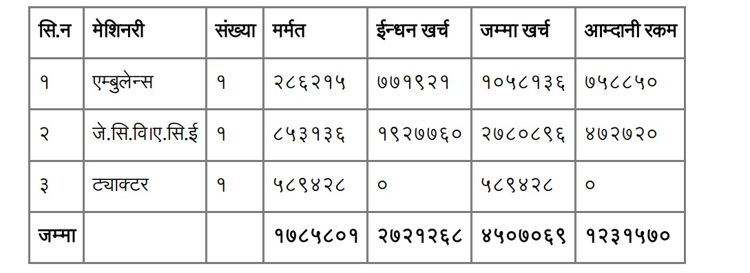 पालिकामा रहेको डोजर, एम्बुलेन्स, शववाहन लगायतको मर्मत र इन्धनमा पालिकाले ५५ लाख ७ हजार ६९ रुपैयाँ खर्च गरेको छ । तर, सोही साधनहरू भाडामा दिँदा जम्मा १२ लाख ३१ हजार ५७० रुपैयाँ मात्र आम्दानी भएको छ । योजनाहरूमा समेत यी साधनको प्रयोग नभएको प्रतिवेदनमा उल्लेख छ । सरकारी साधन स्रोतको उच्चतम प्रतिफल सुनिश्चित गर्ने र सार्वजनिक खर्चमा मितव्ययिता अपनाउनुपर्ने कानुनी व्यवस्था भए पनि भेरी नगरपालिकाको खर्चको शैलीले आर्थिक अनियमितता र जवाफदेहितामाथि गम्भीर प्रश्न उठाएको छ ।