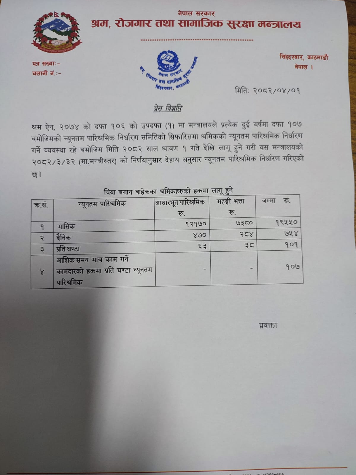श्रमिकको न्यूनतम पारिश्रमिक बढ्यो, अब १९ हजार ५५० रुपैयाँ