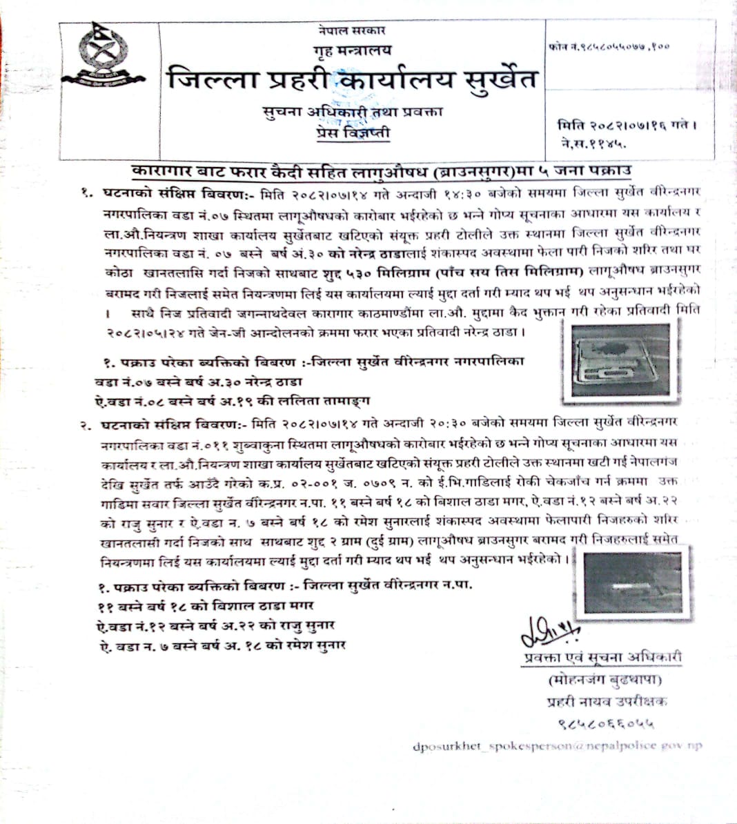 नेपालगंज देखि सुर्खेत तर्फ आउँदै गरेको क.प्र. ०२–००१ ज. ०७०९ न. को ई.भि.गाडिलाई रोकी चेकजाँच गर्न क्रममा सुर्खेत वीरेन्द्रनगर नगरपालिका –११ का १८ वर्षीया बिशाल ठाडा मगर, वडा नम्बर १२ का २२ वर्षीय राजु सुनार र वडा नम्बर ७ का १८ रमेश सुनारलाई प्रहरीले पक्रा गरेको छ । उनीहरुको साथबाट साथबाट शुद्द २ ग्राम (दुई ग्राम) लागूऔषध ब्राउनसुगर बरामद गरिएको जिल्ला प्रहरी कार्यालय सुर्खेतका प्रहरी नायव उपरीक्षक मोहनजंग बुढथापा भनाई रहेको छ ।