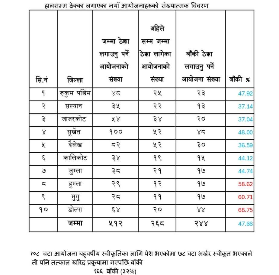 ३२ प्रतिशत योजनाको काम मात्र बाँकी रहेको उहाँले जानकारी दिनुभयो । रुकुम पश्चिममा ३२ , सल्यानमा १३ , जाजरकोटमा २०, सुर्खेतमा ४८ , दैलेखमा ३० , कालिकोटमा १५ , जुम्लामा १७ , हुम्लामा १७ , मुगुमा १७ , डोल्पामा ४४ वटा आयोजनाको ठेक्का लगाउन बाँकी रहेको छ । केही आयोजनाको विवाद त केही आयोजनाको स्रोत सुनिश्चित नहुदा काममा ढिला भएको हो । रुकुम पश्चिममा २५ , सल्यानमा २२ , जाजरकोटमा ३४ , सुर्खेतमा ५२ , दैलेखमा ५२ , कालिकोटमा १९ , जुम्लामा २१ , हुम्लामा १२ , मुगुमा ११ र डोल्पामा २० वटा आयोजनाको ठेक्का लागिसकेको छ ।